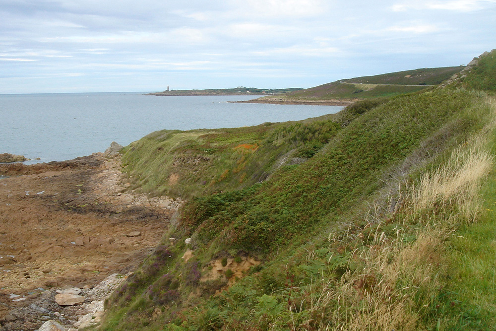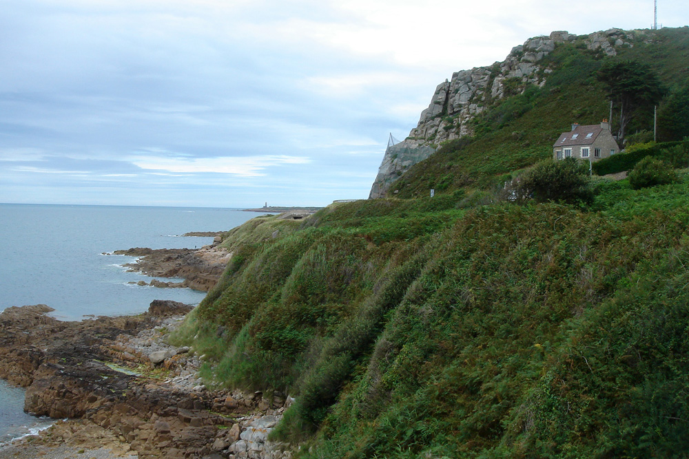 Au-delà du pied du Rocher du Grand Castel qui masque la pointe du Brick et l’anse du Brick, on aperçoit la pointe du Brûlé puis le cap Lévi et son phare. Ce littoral est entièrement façonné dans le granite de Fermanville. |