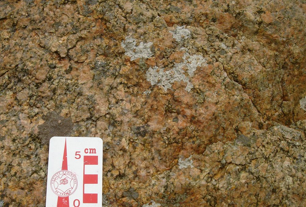 Sur cette surface altérée en partie couverte de lichens incrustants, on observe de nombreux cristaux de feldspath rose, du quartz gris vitreux et de la biotite sombre altérée. |