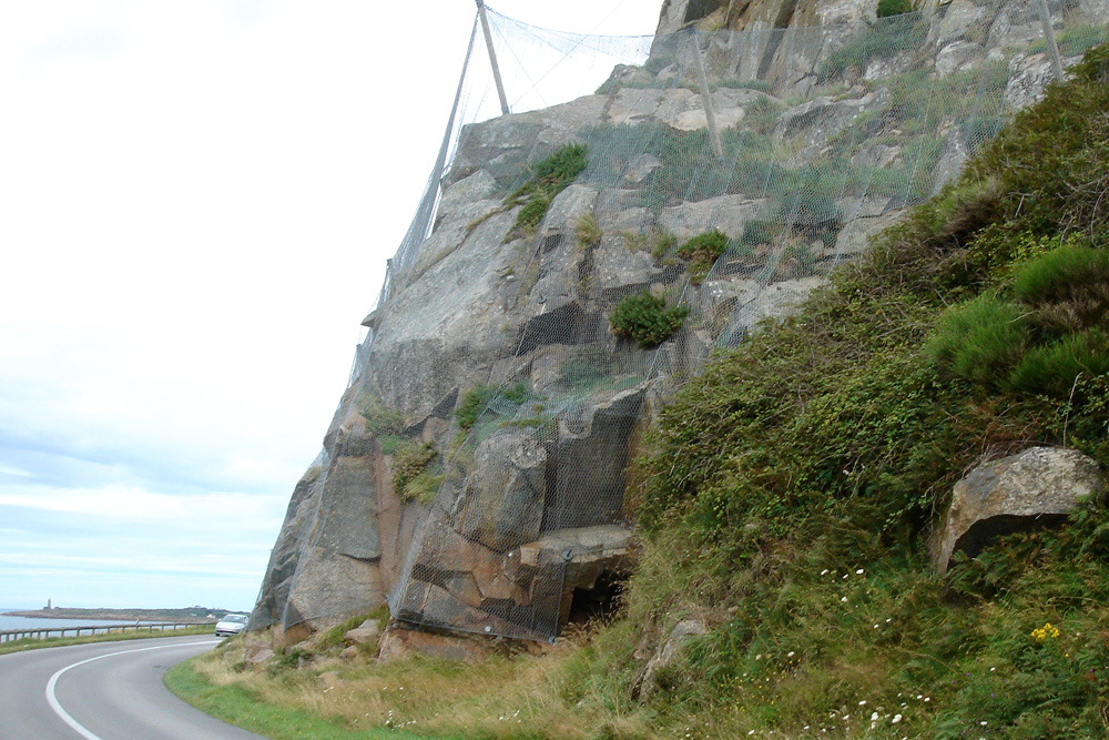 En bordure de route, le granite de la falaise est recouvert par un filet métallique en prévention des éboulements.