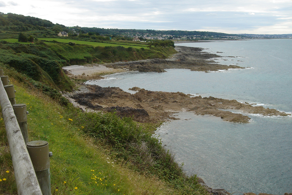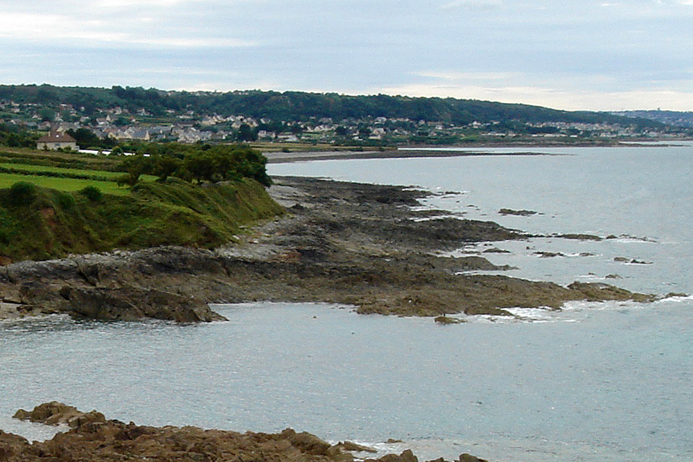 Le Briovérien affleure sur le platier rocheux depuis l’anse du Poulet jusqu’à Bretteville-en-Saire, visible en arrière plan. |