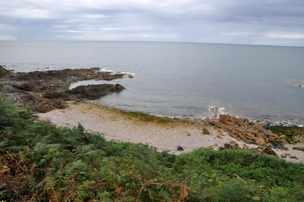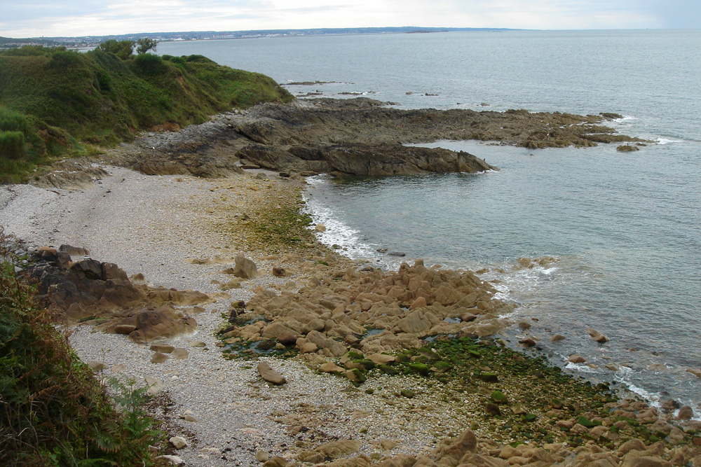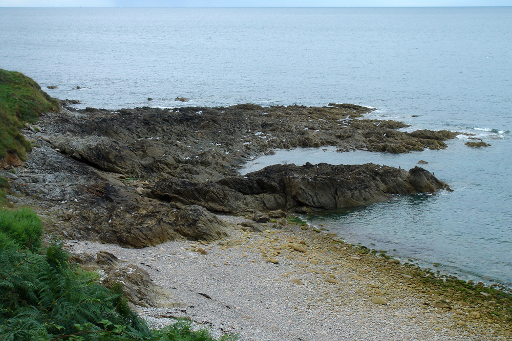 Le contact entre le granite au premier plan, et les terrains briovériens en arrière plan, est masqué par les galets de la plage |