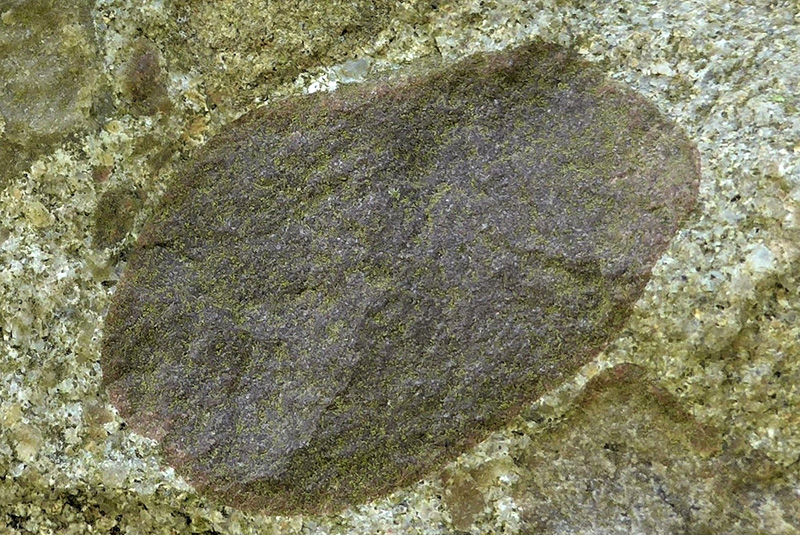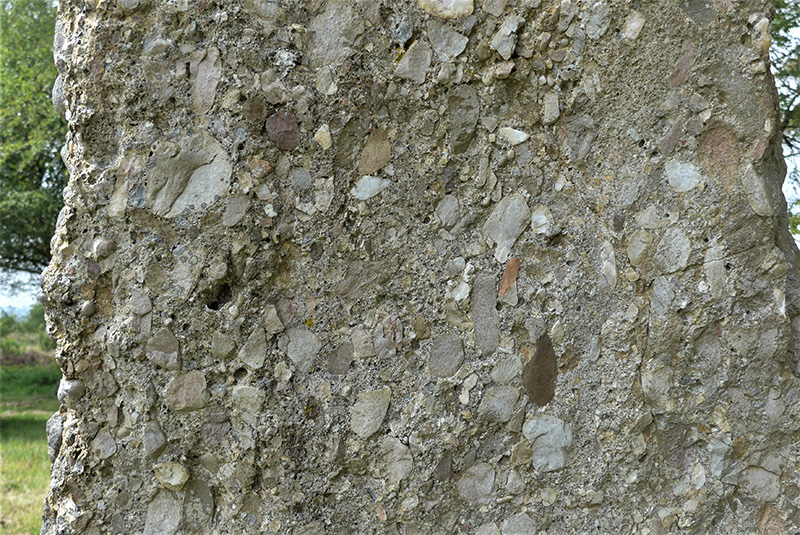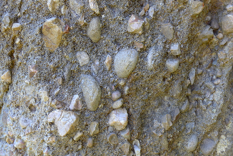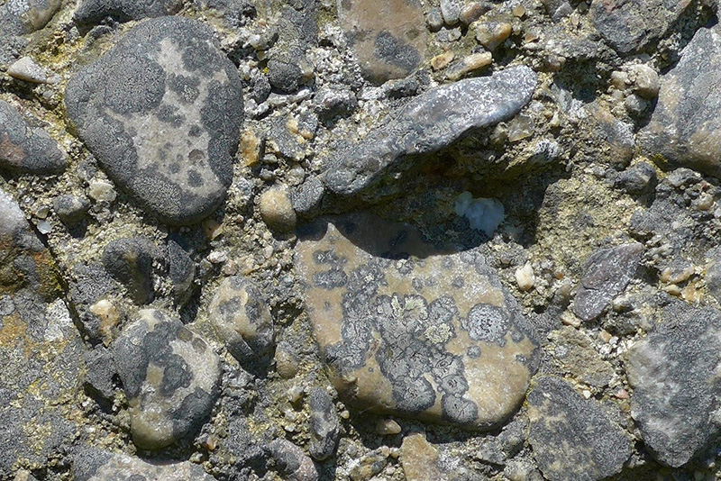 La face exposée correspond à la surface très irrégulière d’un banc de conglomérat constitué d’un mélange de galets et de graviers cimentés entre eux. Des lichens gris incrustants donnent au conglomérat un aspect presque homogène en recouvrant uniformément les différents constituants.