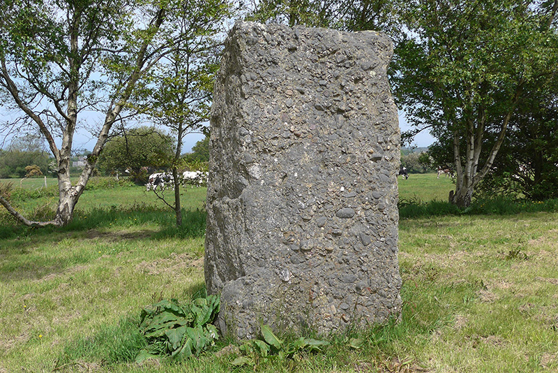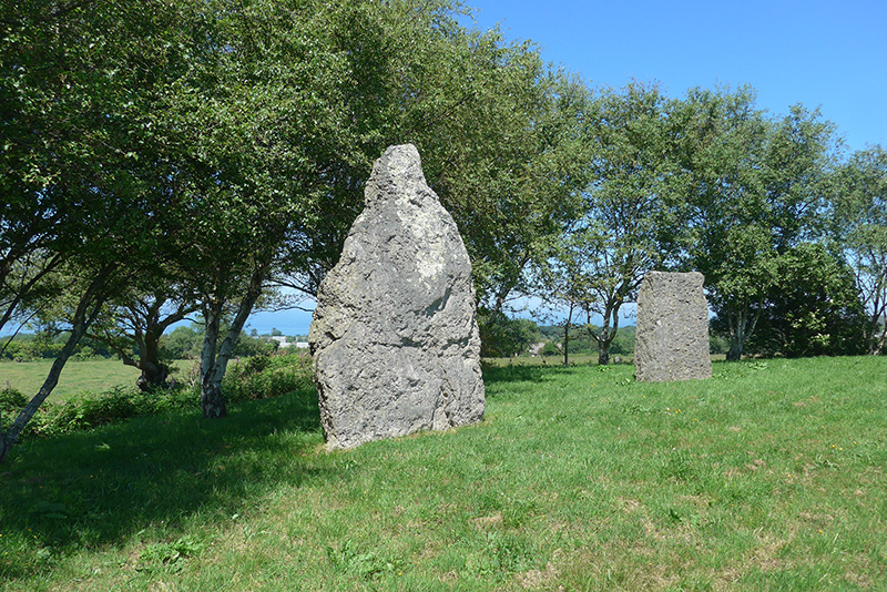 A 1,5 km au Sud de l’anse du Brick, sur le plateau constitué par des terrains triasiques, se dressent deux menhirs issus des conglomérats de la base du Trias. |