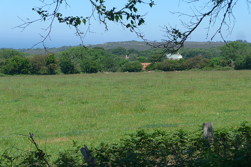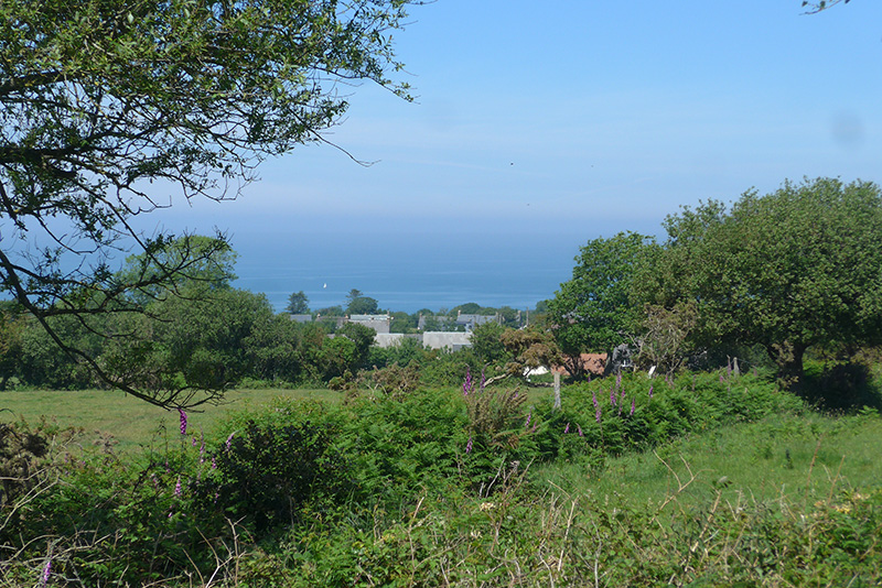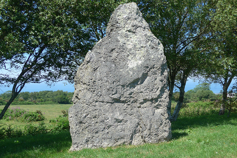 Panorama vers la mer Les menhirs sont situés en bordure du plateau constitué par les terrains triasiques, à une altitude de 130 m environ. Au-delà des prairies, à la rupture de pente, le plateau triasique laisse la place, jusqu’à la mer, aux terrains plus anciens sous-jacents : Schistes briovériens à l’ouest et Granite de Fermanville à l’Est.