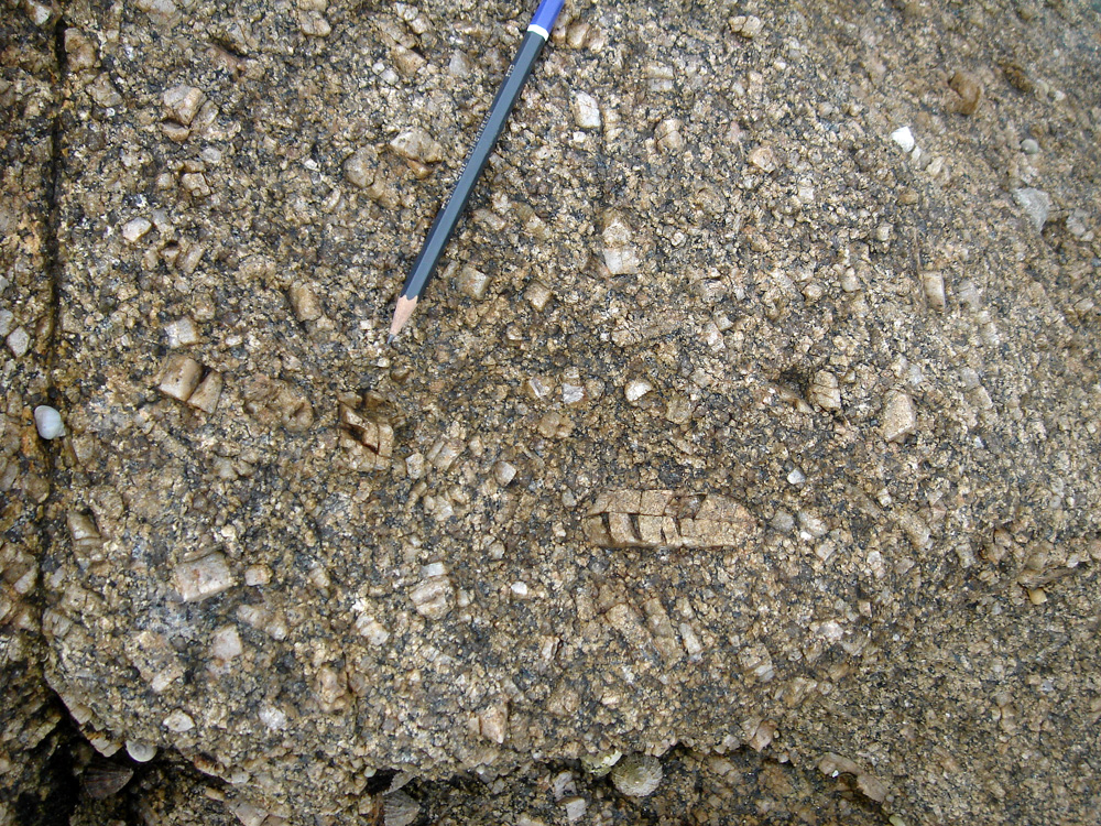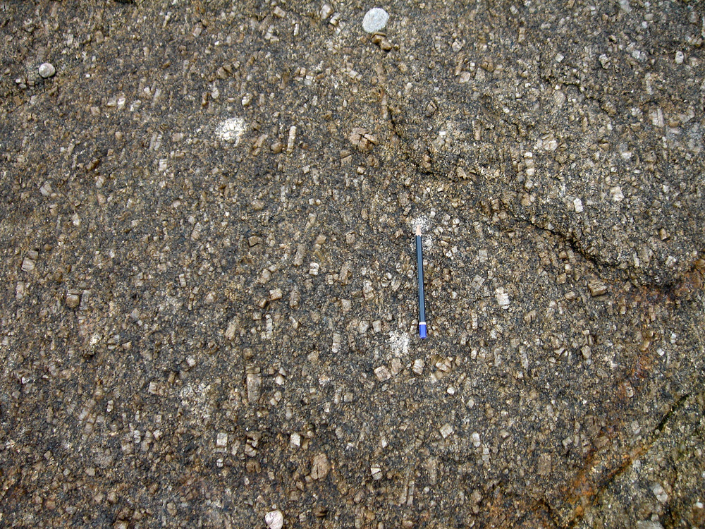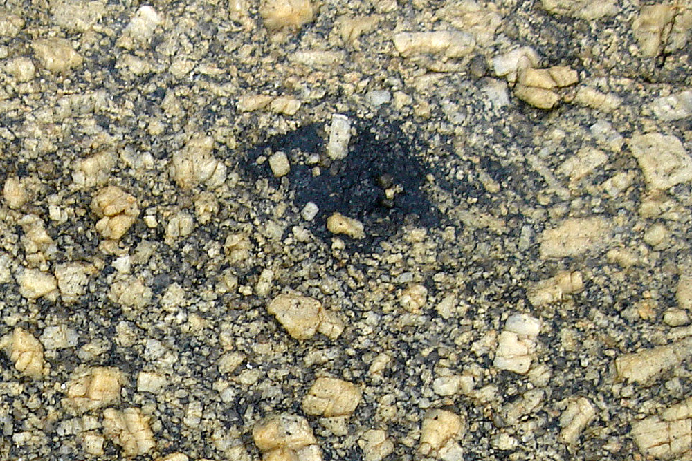 Cette petite enclave basique contient des cristaux de feldspaths semblables à ceux du granite environnant ; ces feldspaths se sont formés dans le magma granitique et, sous la poussée de ce dernier, ont été injectés dans le magma basique encore visqueux. |