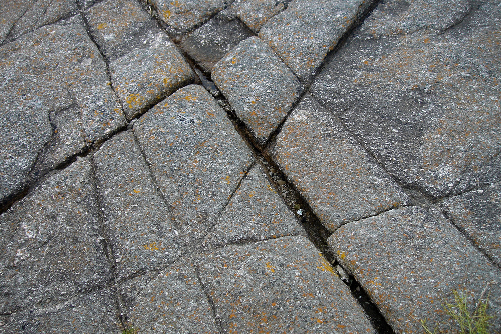 Un réseau de diaclases découpe le granite du platier rocheux. |
