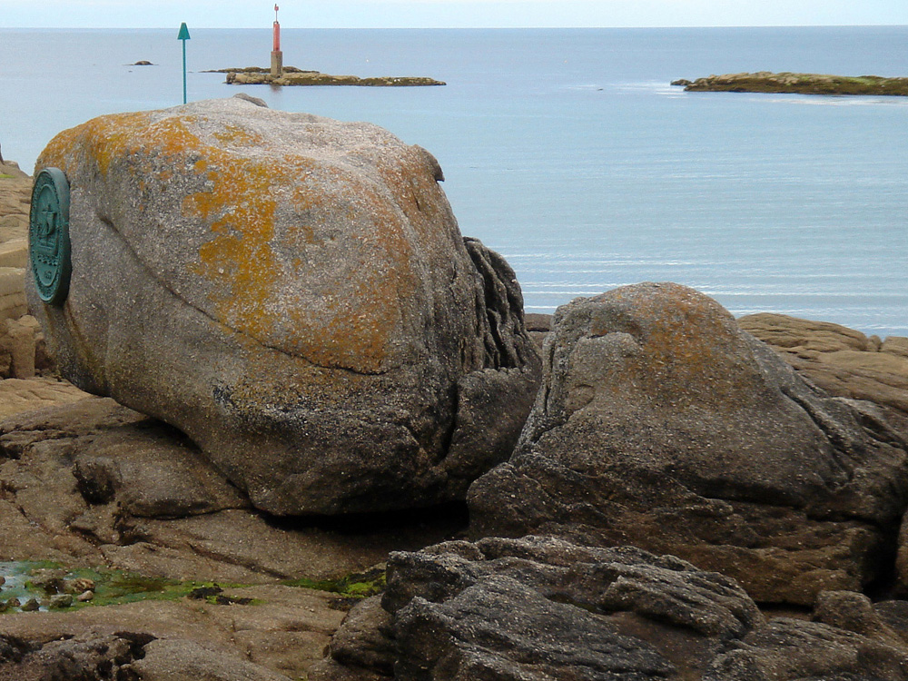 Le rocher qui porte la plaque commémorative est un gros bloc isolé par l’érosion après altération et arénisation du granite. A l’arrière de ce bloc on observe des écailles de desquamation caractéristiques du processus d’altération aboutissant à la formation de boules de granite. |