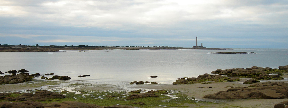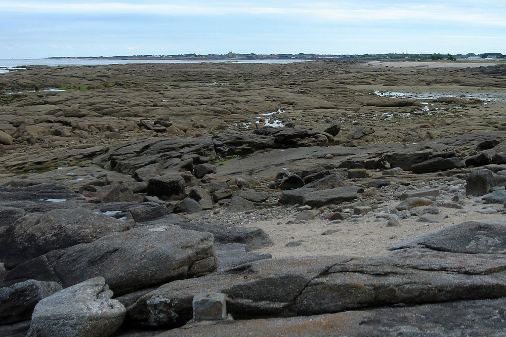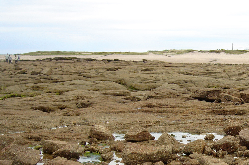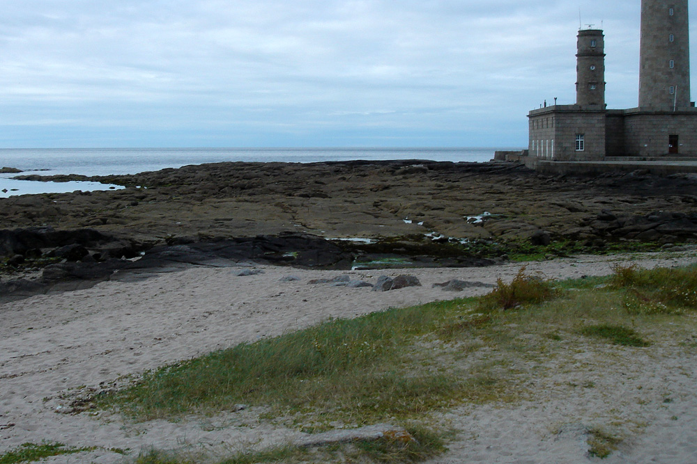 Le platier rocheux qui s’étend au pied du phare correspond à la plate-forme d’abrasion marine actuelle. Sur la ligne de rivage, le granite est recouvert par un cordon littoral sableux. |