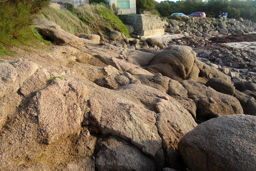 Les blocs de la base sont dégagés progressivement de l’arène par l’érosion marine alors qu’en hauteur, les blocs sont encore empâtés dans l’arène granitique.