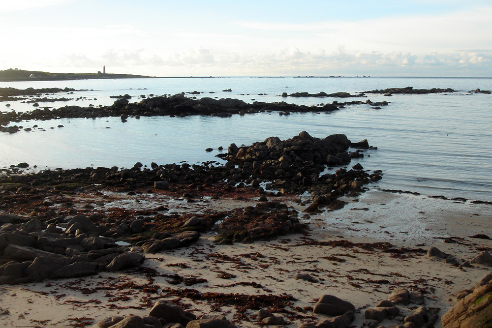 Une boule granitique particulièrement volumineuse émerge du flot de la marée montante. A survoler