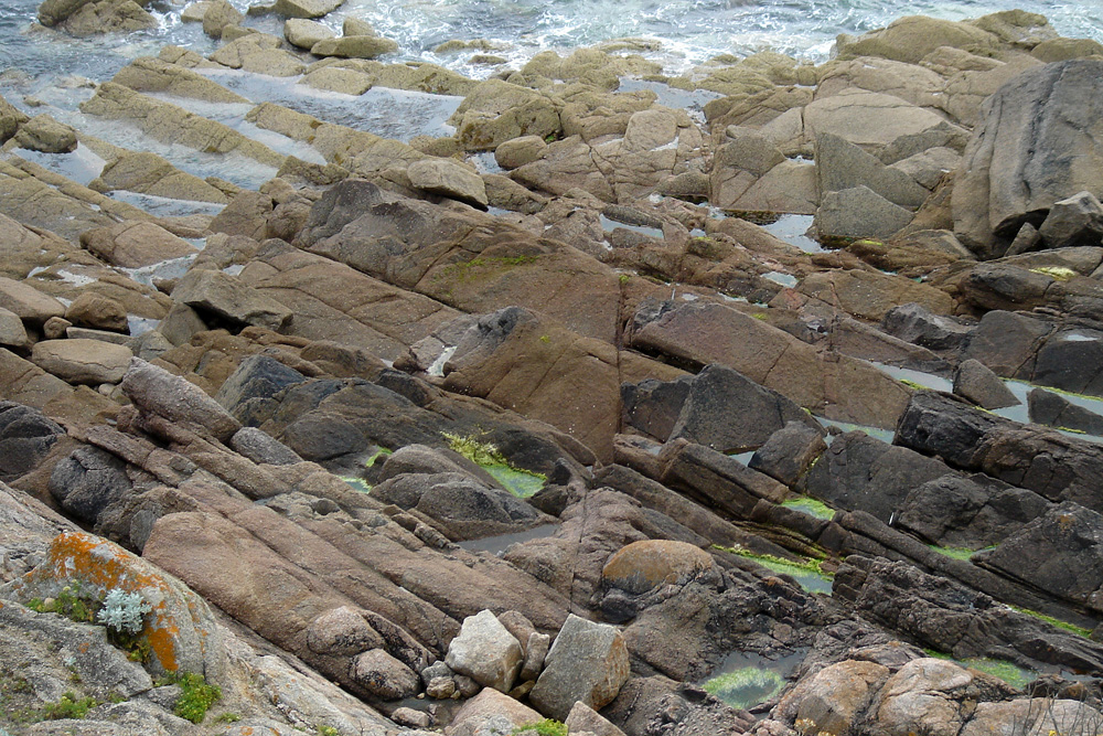 Sur le platier de la pointe du Vieux Fort (secteur SW), le granite est découpé par un réseau de diaclases. Au pied de la falaise (au premier plan) on peut observer l’ébauche de boules résultant de l’altération du granite, favorisée par les diaclases. |