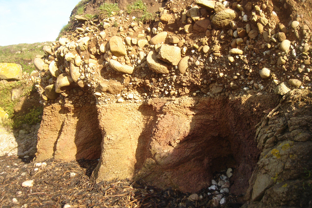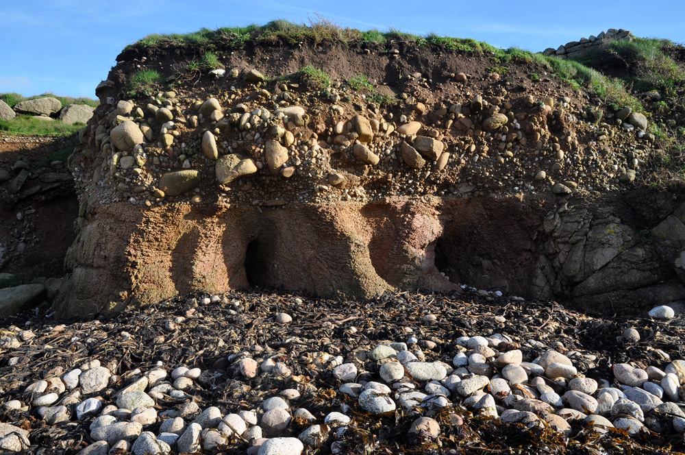 Les galets de la plage actuelle (au premier plan) sont semblables aux galets de la plage perchée éemienne ; ils proviennent du démantèlement de la plage perchée par l’action érosive de la mer. La plage actuelle contient une plus forte proportion de gros galets, les plus petits galets pouvant être transportés plus loin. |