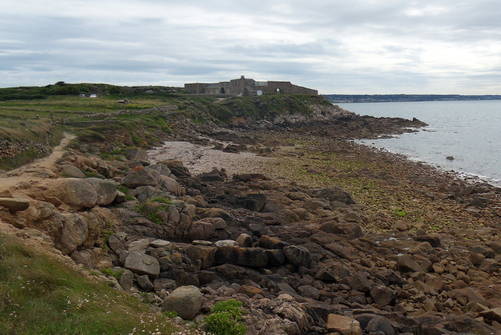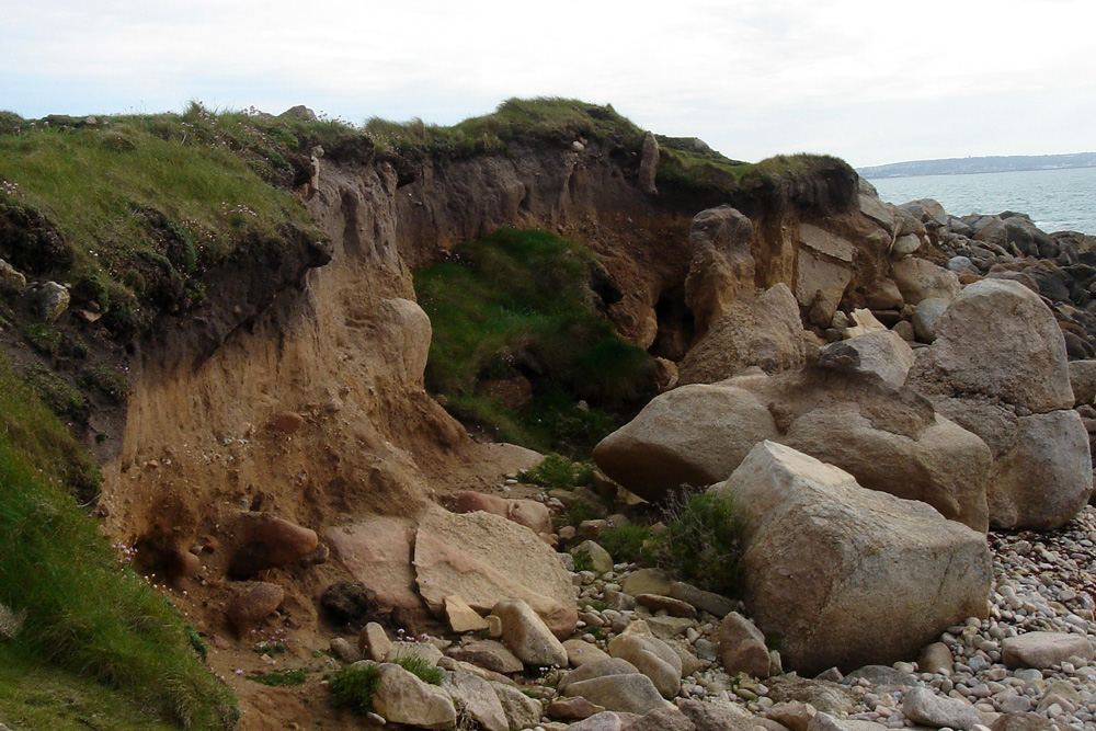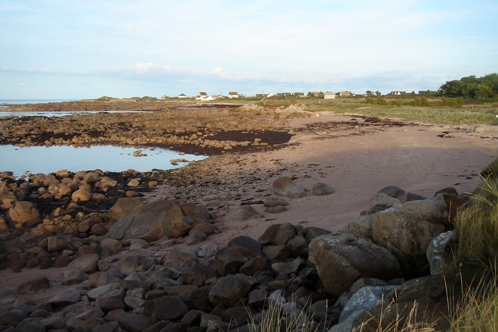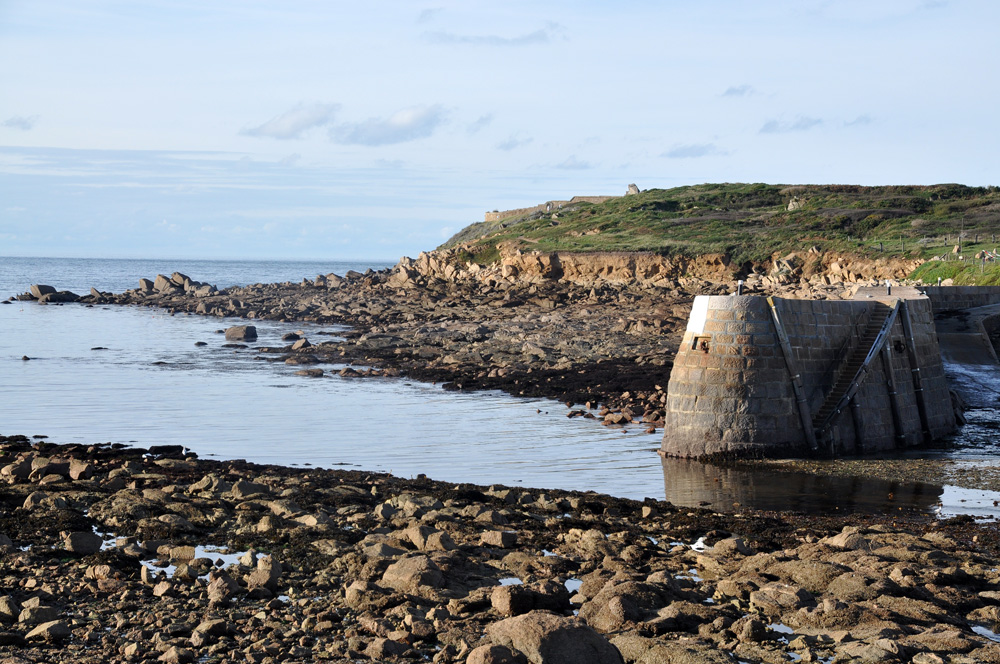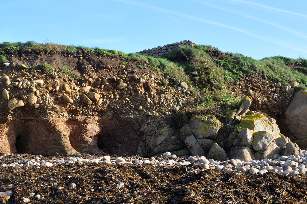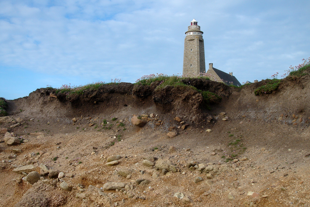 Des rochers granitiques et une petite colonne rocheuse isolée témoigne du recul de la falaise sous l’action de l’érosion marine.