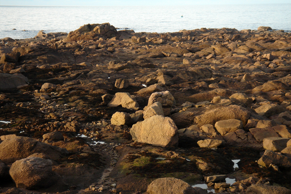 L’érosion marine façonne un platier rocheux dans le granite. Les formations quaternaires et l’arène granitique ont été emportées par la mer et le granite sain (substratum et boules éparses) est mis à nu.