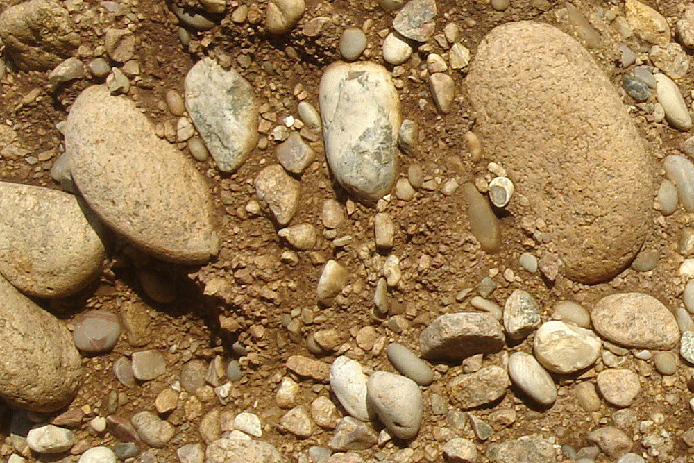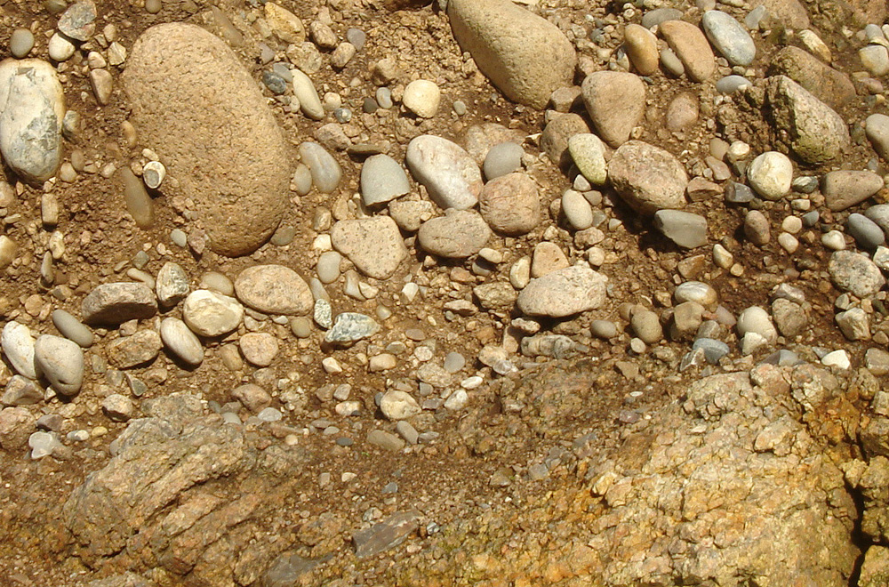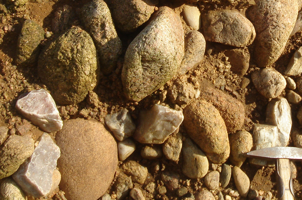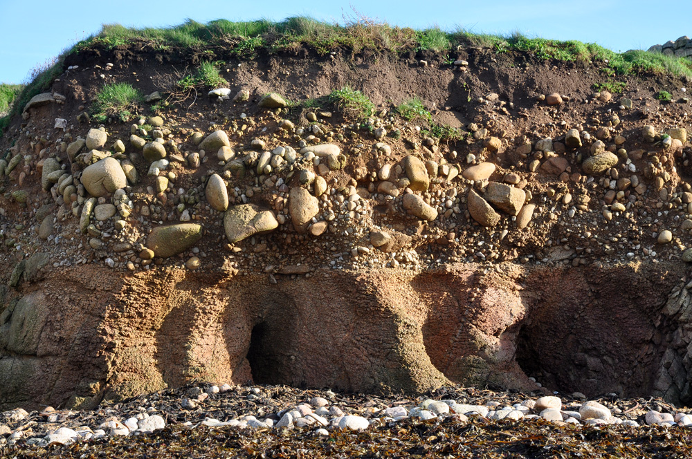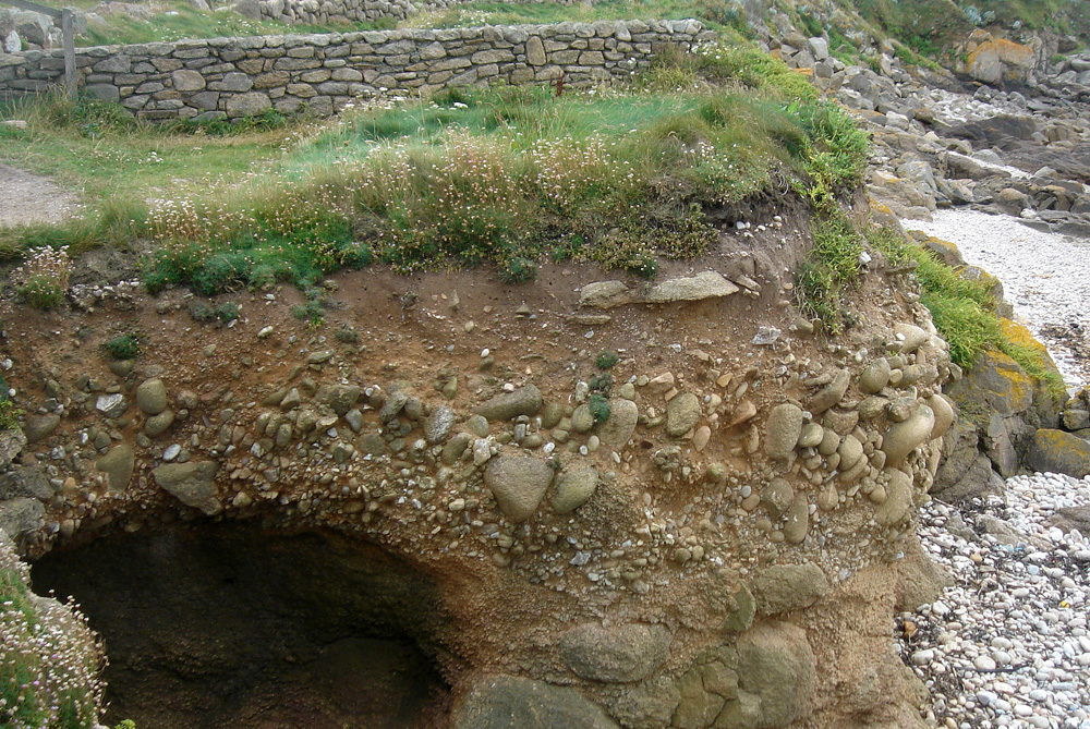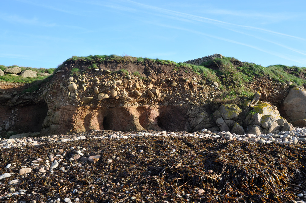 A la base de la plage éemienne, des galets et des graviers recouvrent le granite en voie d’arénisation. |