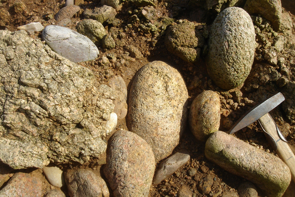 De gros galets de granite sain et un bloc de granite arénisé sont emballés dans du sable grossier formé essentiellement d’arène granitique. La majorité des éléments de la plage éemienne provient de l’érosion du granite de Fermanville sur lequel la mer s’est avancée il y a 120 000 ans. |