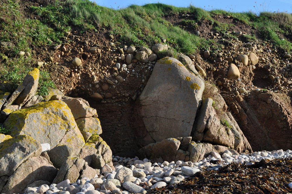 La plage éemienne moule les irrégularités de la surface d’abrasion comme ce rocher de granite sain qui a résisté à l’érosion et à l’arasement complet de la plate-forme littorale.