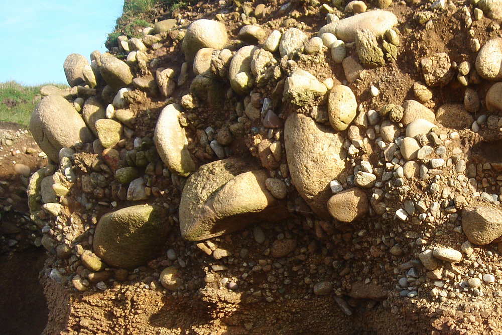 La cryoturbation a perturbé l’agencement des constituants de la plage éemienne ; ainsi, des gros galets arrondis de la plage éemienne ont été redressés presque à la verticale. La cryoturbation est liée à une succession de phases de gel et dégel lors de la période de climat périglaciaire (Weichsélien) qui a suivi la période tempérée éemienne. |
