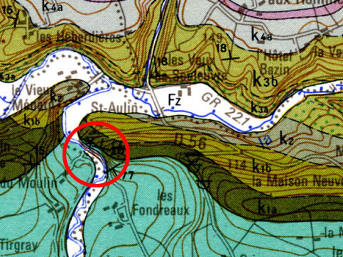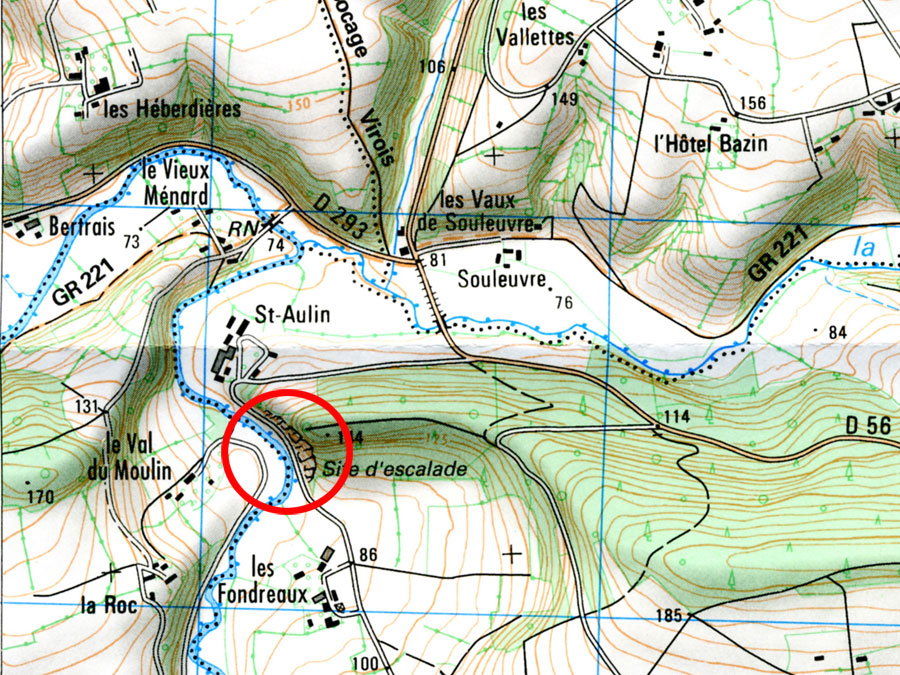 L’affleurement de la discordance cadomienne est localisé au lieu-dit de Saint Aulin, sur le site d’escalade de Carville (14), commune située entre Le Bény-Bocage et Pont-Farcy dans la partie Ouest du département du Calvados.