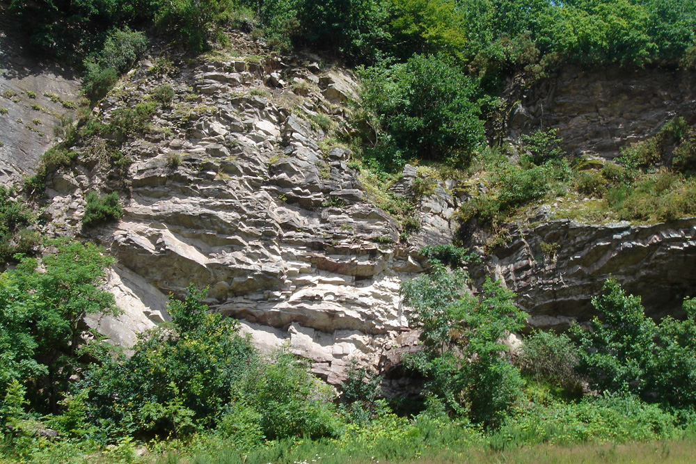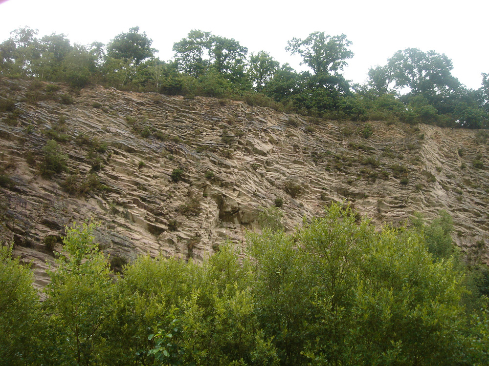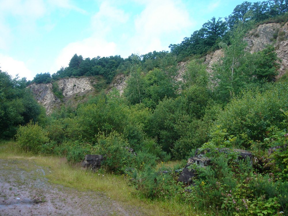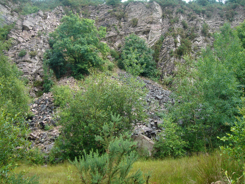 A l’entrée nord de la carrière, la base du front de taille et des blocs épars longent le chemin. Les bancs plongent d’environ 45° vers le NE ; ils appartiennent au flanc sud du synclinal varisque de May.