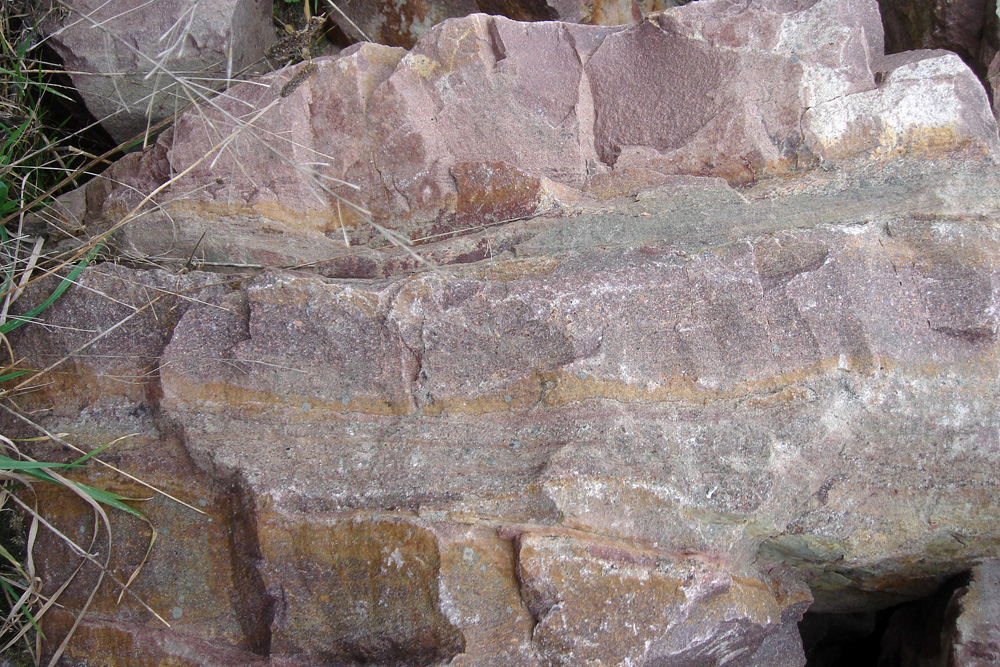 Minces lits d’argilite verdâtre à ocre intercalés dans les grès arkosiques roses d’un bloc éboulé. |