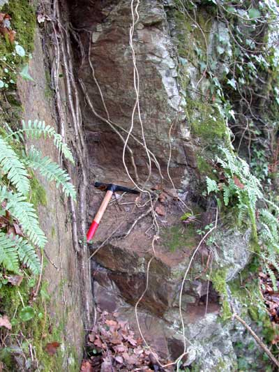 et utilisée comme terrain d'entraînement militaire. Le chemin d'accès part du parking de l'usine de "béton vibré" (domaine privé) et monte à flanc de coteau, jusqu'à une barrière. L'affleurement principal de tillite est situé à gauche de cette barrière. La Tillite de Feuguerolles ne présente pas de stratification, les plans visibles correspondent à des fractures. |