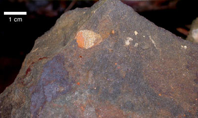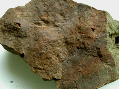 A l'affleurement, la Tillite de Feuguerolles est constellée de petites cavités aux contours anguleux. Celles-ci correspondent à l'emplacement d'anciens éléments calcaires qui ont été dissous par les eaux d'infiltration. |