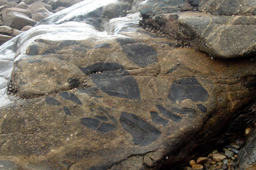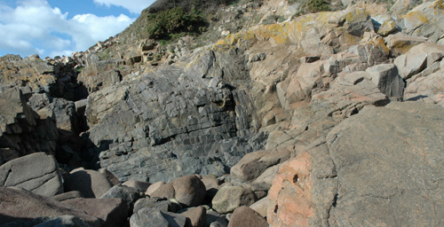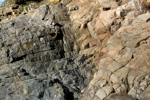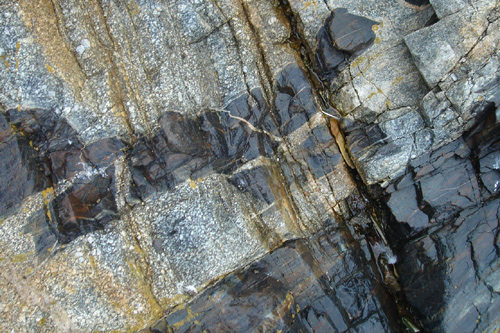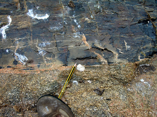 Ici, un lacis de petits filons granitiques roses suit le contact avec