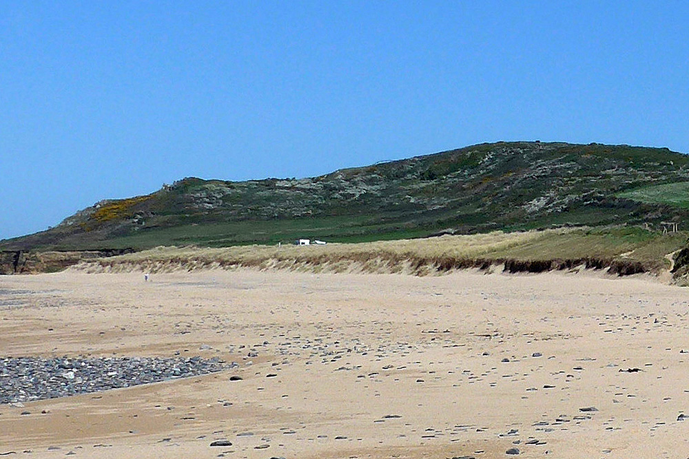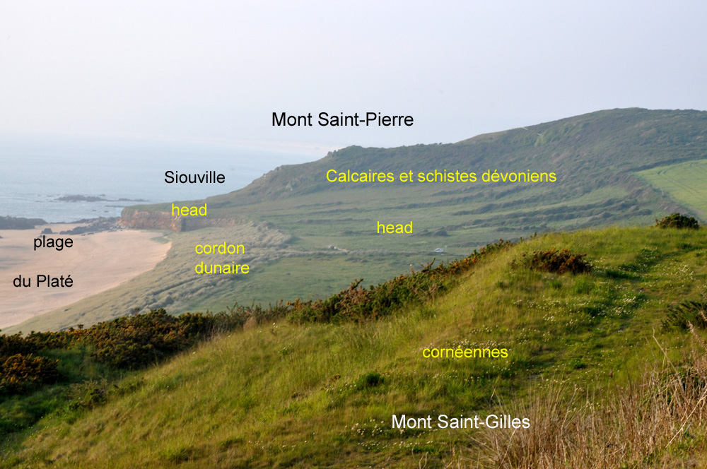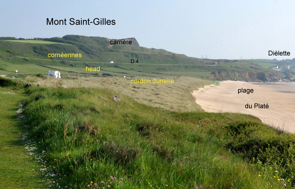 Encadré par les monts Saint-Gilles et Saint-Pierre, le versant du Platé qui descend en pente douce vers la plage présente un profil concave. Il est occupé par un vaste head qui se prolonge au Nord dans la fausse terrasse du Mont Saint-Pierre. Le pied du head est masqué par un cordon dunaire holocène. Vue prise depuis le Mont Saint-Gilles vers le Nord A survoler