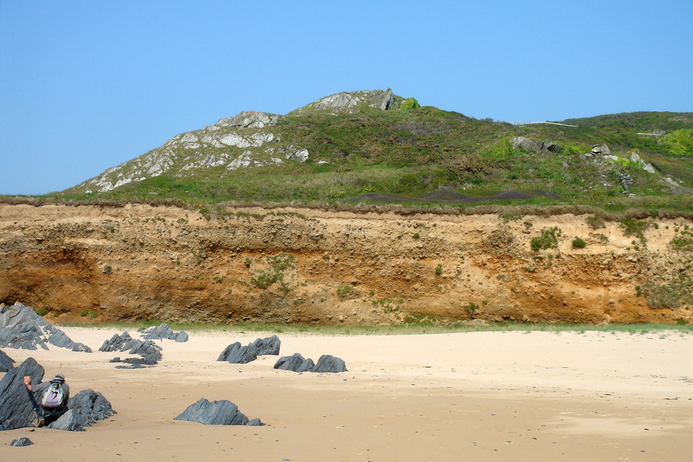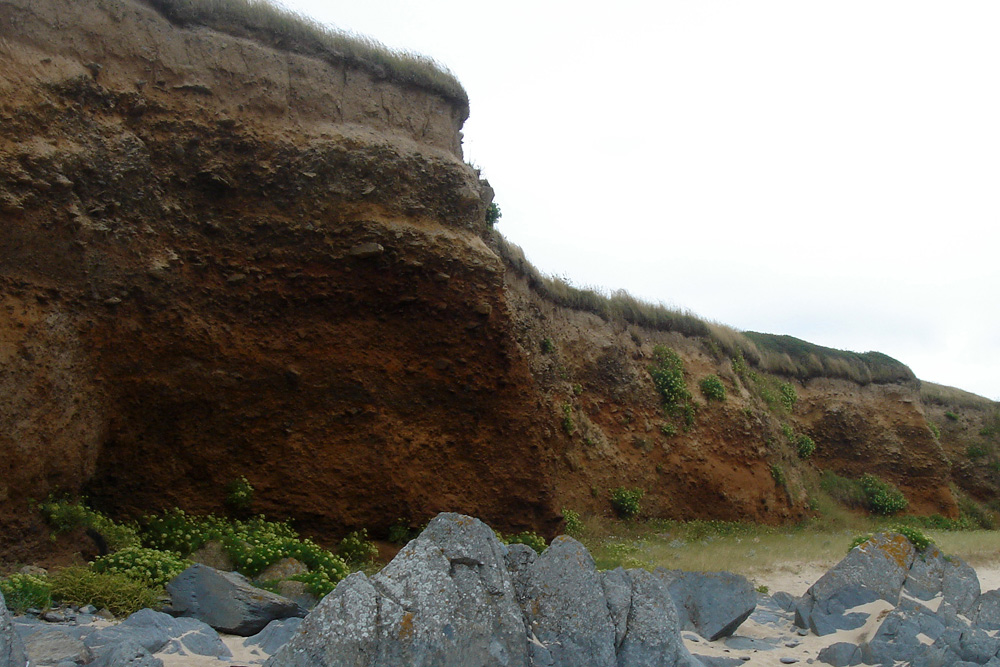 Un lambeau de plage ancienne, de 0,60 m d’épaisseur, affleure à la base de la falaise, sous le head. Cette plage ancienne témoigne d’un haut niveau marin correspondant à un climat tempéré, il y a environ 110 000 ans.
