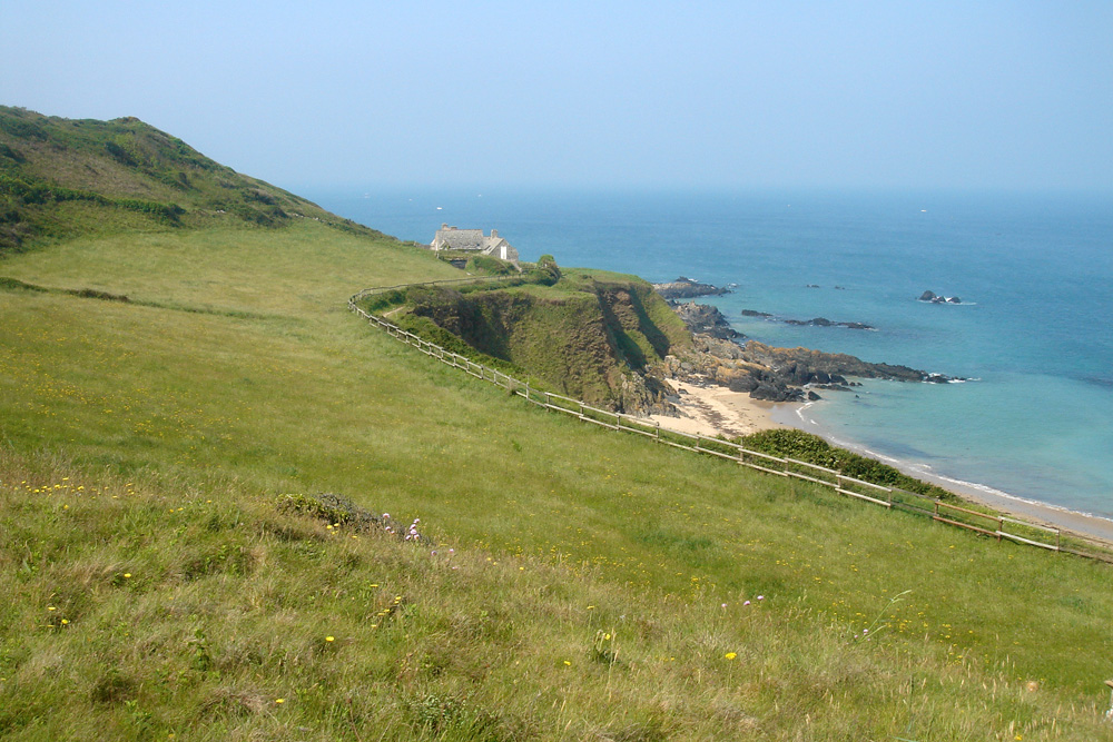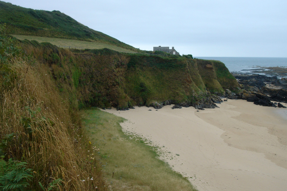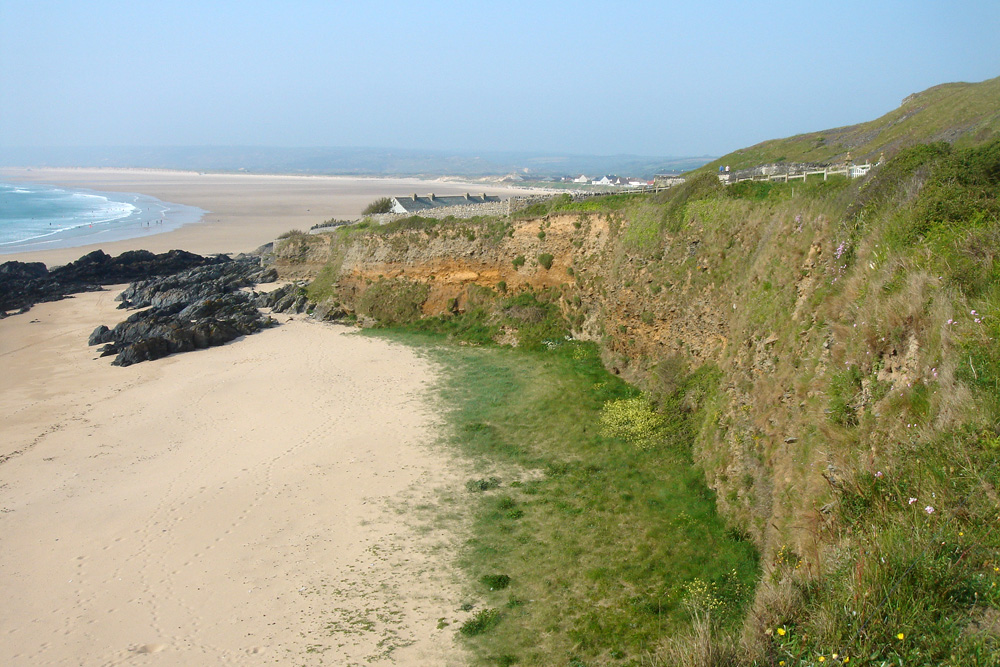 Au-dessus de la falaise vive, la prairie en pente douce correspond à la surface du head. Elle est dominée par une falaise morte façonnée dans le substratum paléozoïque (schistes et calcaires dévoniens) qui affleure sous le head au pied de la falaise vive exposé aux assauts de la mer.
