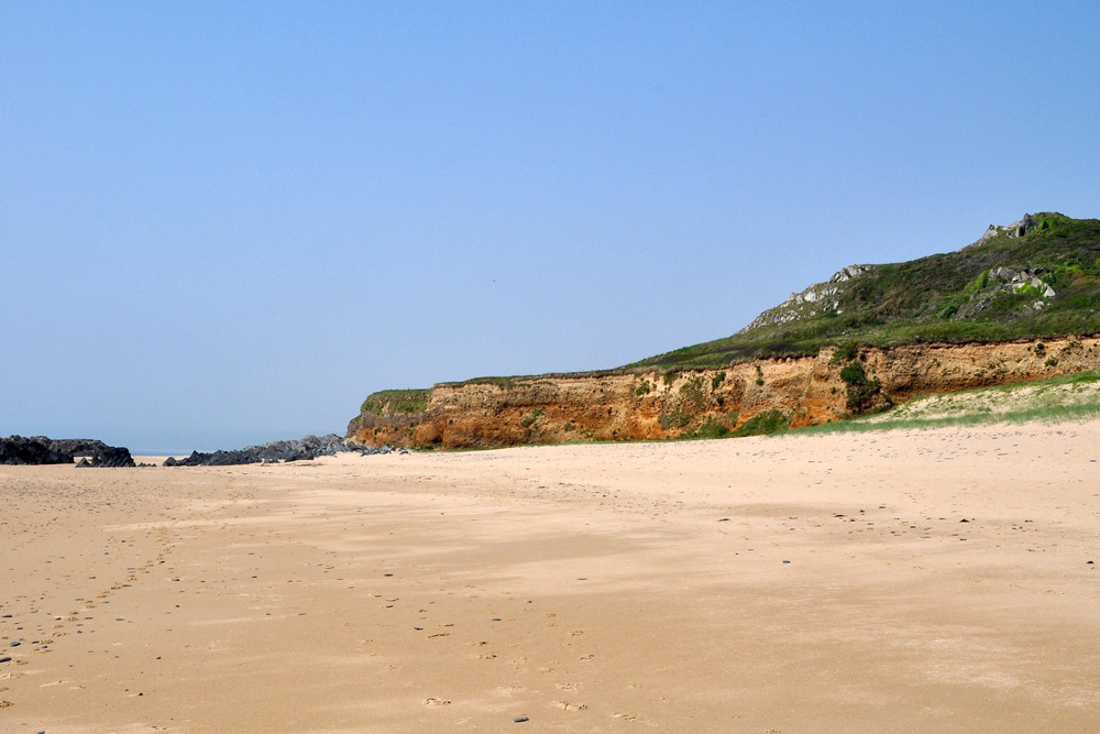 Au premier plan, une ébauche de cordon dunaire se développe au pied de la falaise vive dans une zone abritée.