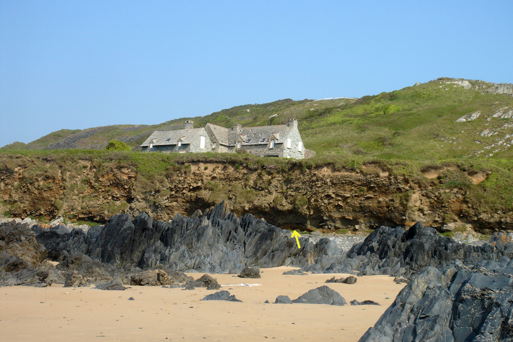 L’affleurement de plage éemienne se situe à la base de la falaise au niveau du pignon sud de la maison.