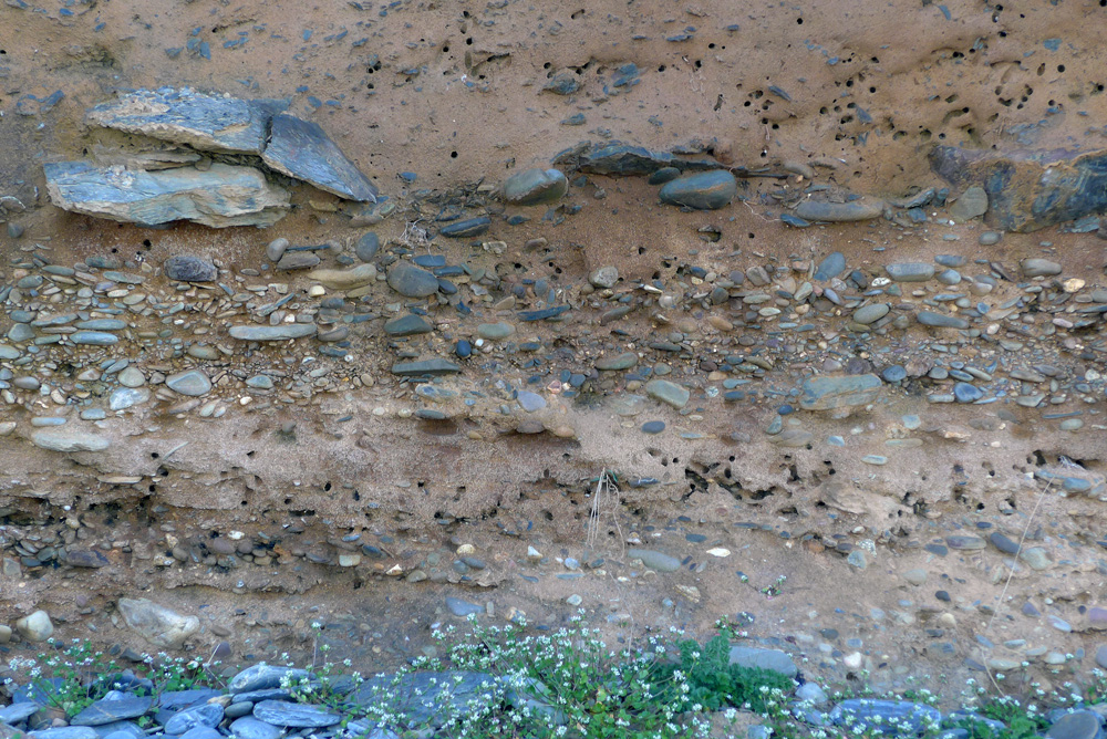 Un bloc de quartz émoussé surmonte un niveau riche en graviers et en galets très aplatis. |