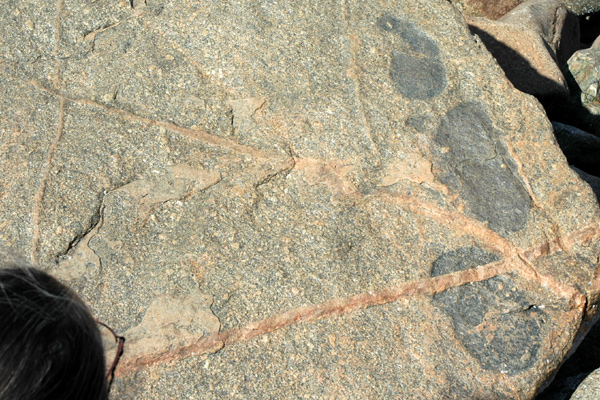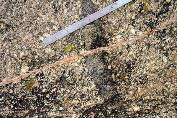 de recoupement Un petit filon aplitique traverse une enclave basique du granite ; les deux parties de l’enclave se sont légèrement décalées de part et d’autre du plan de fracture suivi par le filon. |