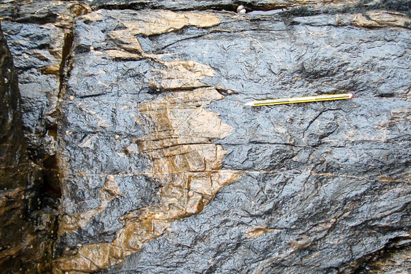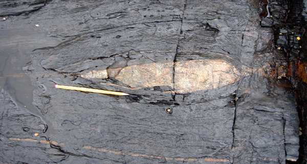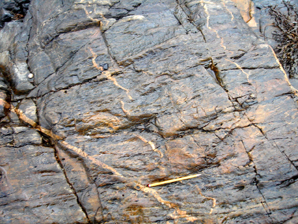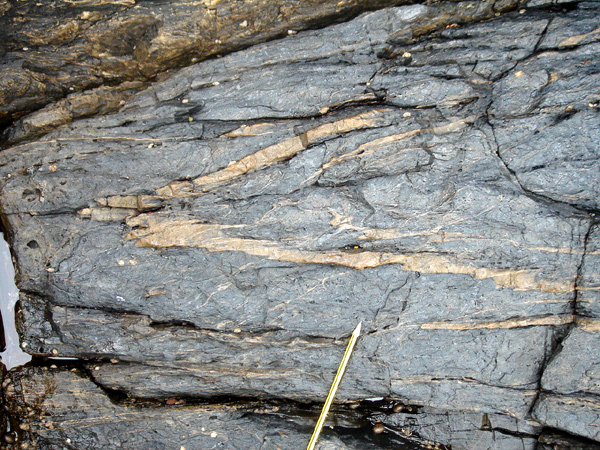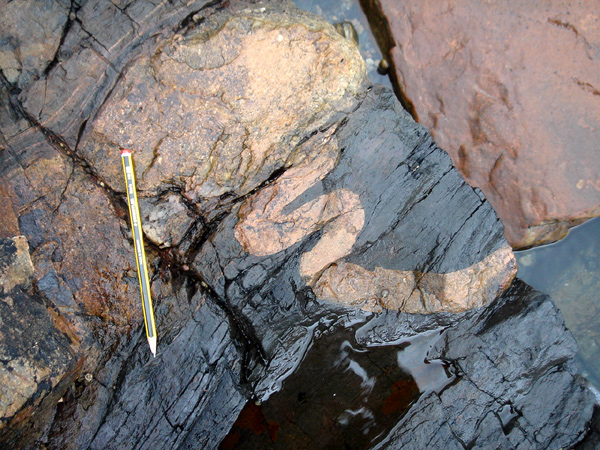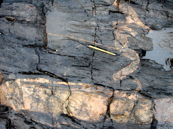 Le filon injecté dans les cornéennes ne suit pas une trajectoire rectiligne, il s'insinue dans les plans de schistosité qu'il déforme. |
