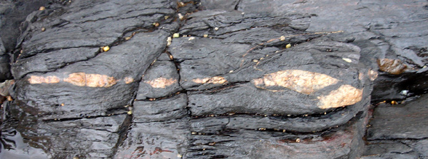 Ces filons présentent une alternance de tronçons dilatés et de zones d’étranglement. Ces figures de boudinage résultent d’un système de contraintes de poussée créé par la mise en place du granite. |