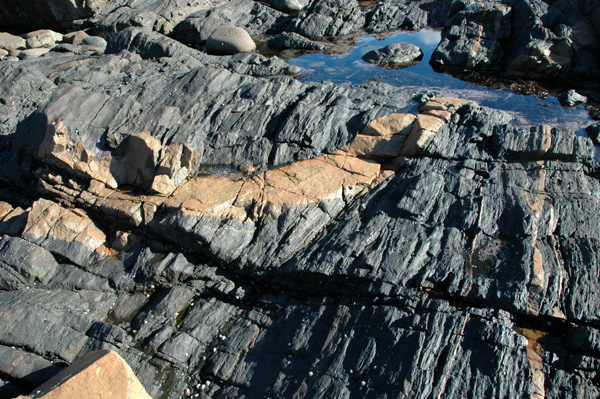 Filon aplitique Un filon aplitique, rose et épais, recoupe à l’emporte-pièce les cornéennes, noires et schistosées ; ce filon s’est mis en place tardivement, alors que les cornéennes étaient déjà déformées par la poussée exercée par le granite. |