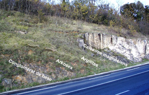 successivement : La succession conglomérat, arkose, argilite correspond à une sédimentation détritique continentale à granoclassement positif (la taille moyenne des grains se réduit avec le temps) correspondant à une énergie décroissante. Le matériel détritique est fourni par le démantellement de la chaîne cadomienne. Avec l'apparition des calcaires, la sédimentation détritique est remplacée par une sédimentation chimique carbonatée. Ces calcaires sont probablement lagunaire ou lacustre. |