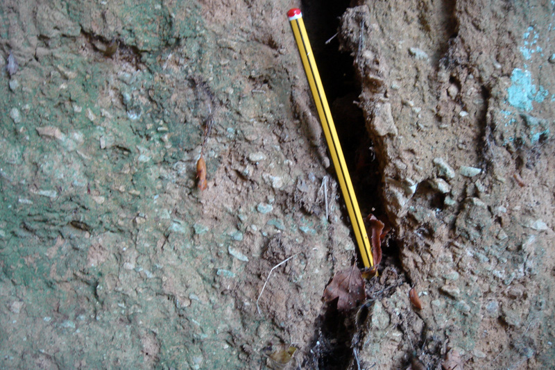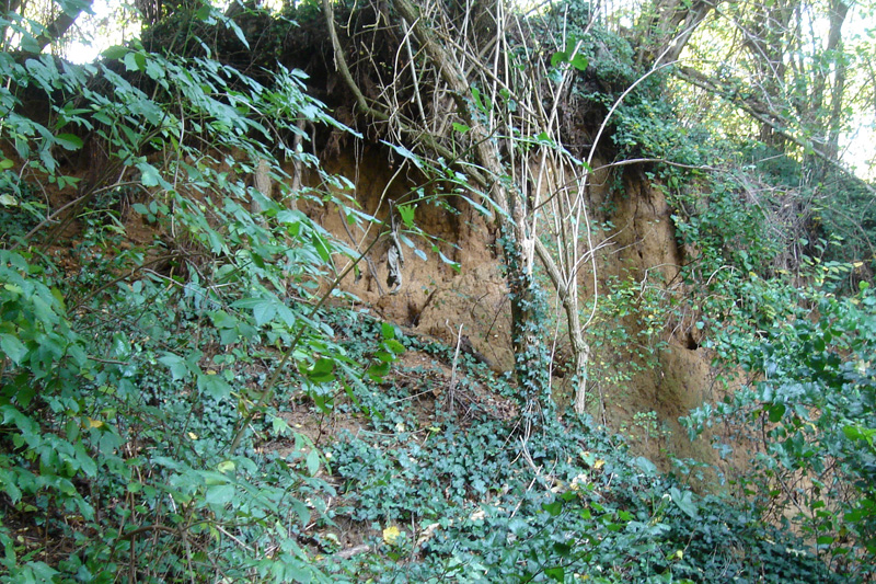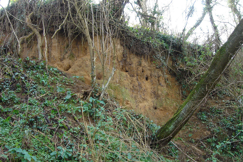 Une importante accumulation de lœss forme un escarpement d’environ 5 m de hauteur en bordure du chemin qui remonte le vallon du Val Joli, en rive droite de la Guigne. Ce lœss s’est déposé lors de la dernière glaciation quaternaire (Weichselien). |