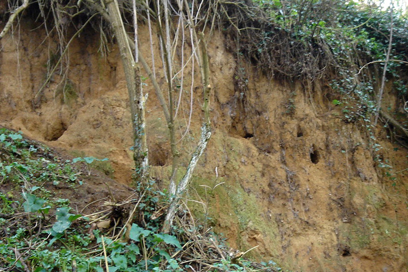 Le lœss est creusé de nombreux terriers car c’est un sédiment friable mais cohérent. Les particules qui le composent sont essentiellement des limons dont la taille est comprise majoritairement entre 26 et 36 µm, associés à un peu d’argile et de sable fin. Sur le plan minéralogique, c’est un lœss calcaire (15 à 18% de carbonates) à grains anguleux quartzeux et calcitiques, comme le lœss des plateaux de la Campagne de Caen.