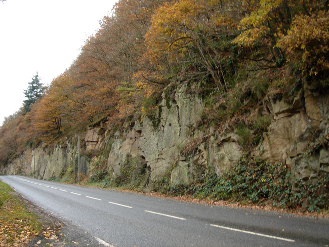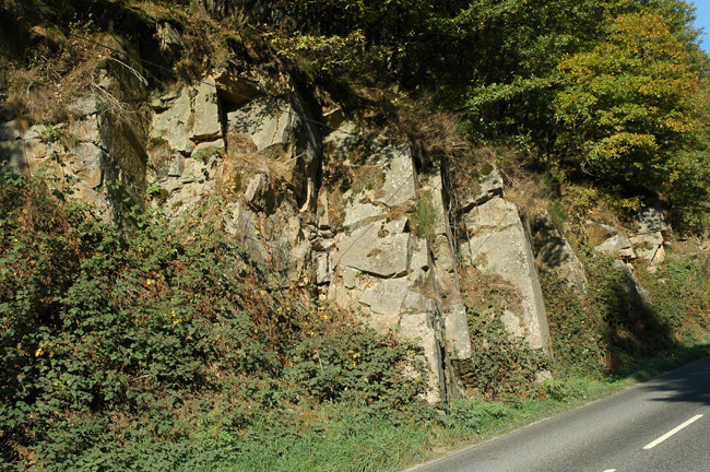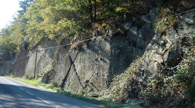 La granodiorite est une roche massive. Le découpage par les joints subverticaux crée de grandes dalles aux surfaces planes presque parallèles à la route.