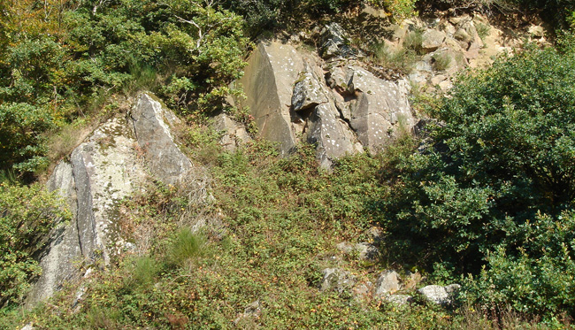 La granodiorite affleure sur une cinquantaine de mètres le long de la route D17, en face de l’usine de cotons-tiges Lemoine SA, au lieu-dit La Martinique (la Petite Suisse sur la carte topographique à 1/ 25 000) |