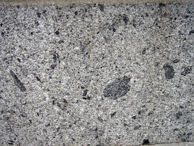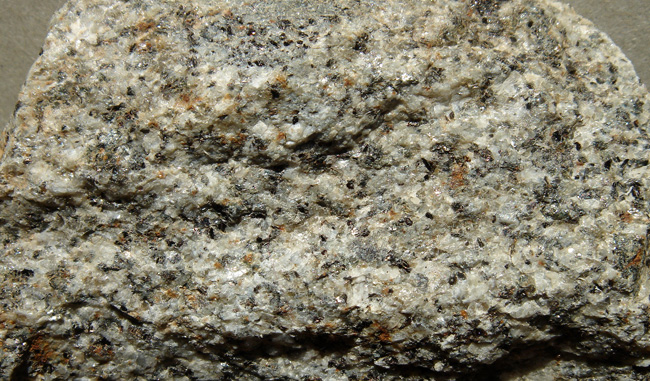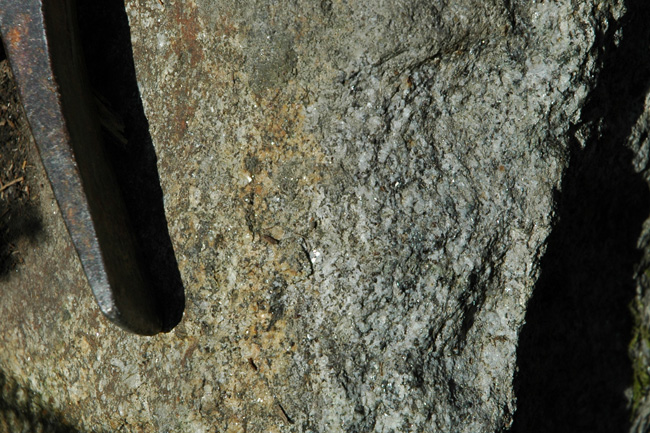 Sur une cassure fraiche, la granodiorite d’Athis révèle sa teinte gris-bleu et sa texture grenue, isogranulaire et à grain moyen.