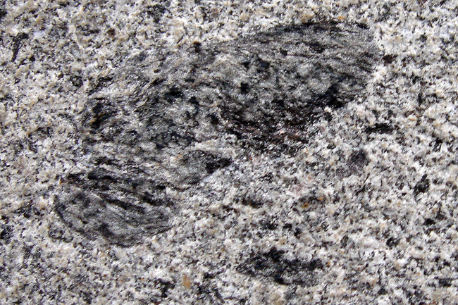 Enclave sombre gneissique, témoin de la croûte inférieure, d’où est issu le magma granitique. |