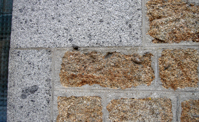 Dans les murs, les autres pierres (taillées mais non polies) sont souvent de couleur rousse, ce qui correspond à de la granodiorite altérée.