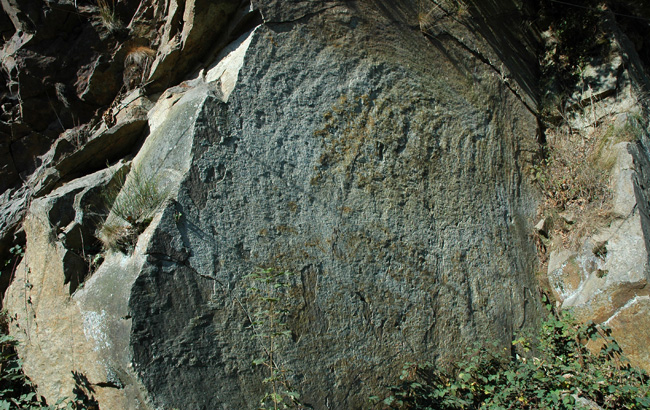Les figures plumeuses présentes à la surface de cette dalle massive de granodiorite ont une origine extensive ; elles indiquent que les joints qui délimitent les blocs sont des fractures d’extension. |