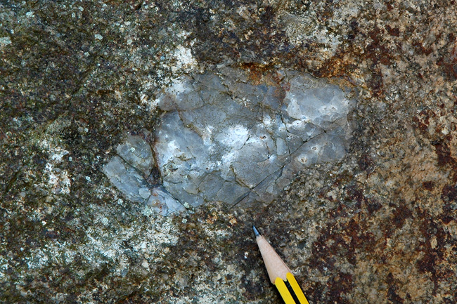 La granodiorite contient aussi de la cordiérite, jusqu’à 8 %, visible en lame mince. |