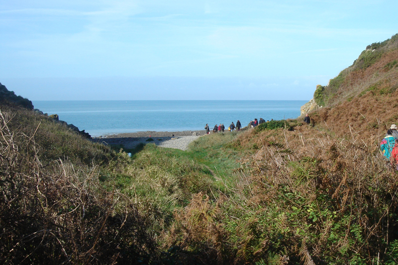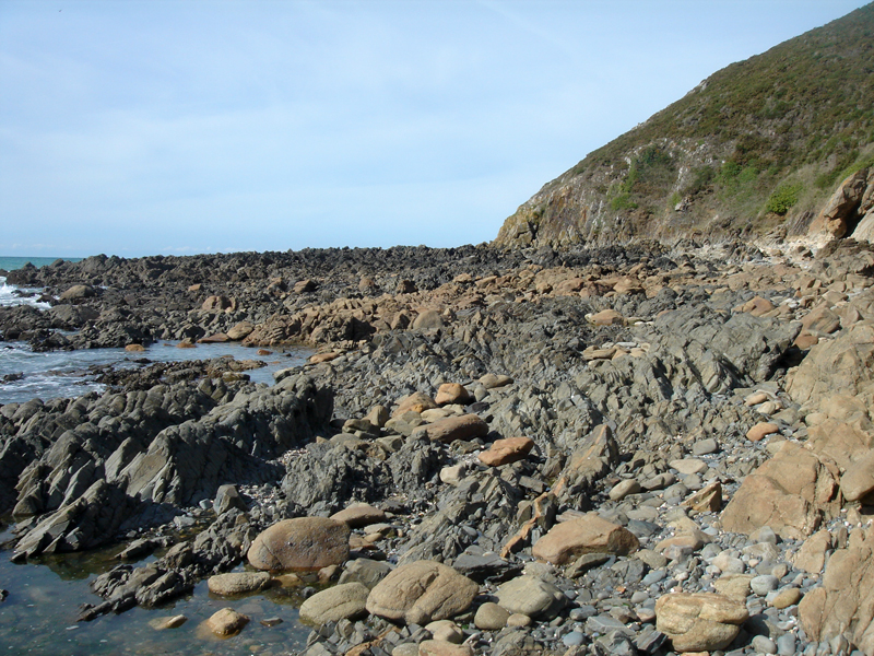Le chemin d’accès suit la vallée du Lude jusqu’à la mer. A ce niveau, la granodiorite forme les versants de la vallée ainsi que la falaise littorale ; les cornéennes affleurent sur l’estran. |