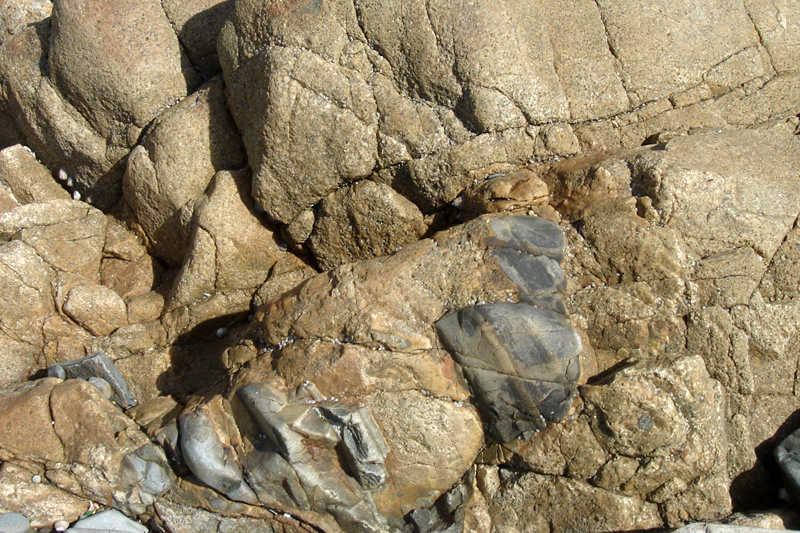 La granodiorite affleure dans les gros rochers de la partie haute de l’estran et dans la falaise ; elle reste visible à marée haute.